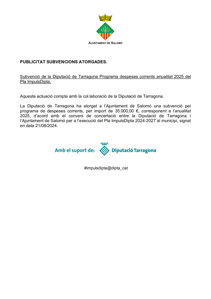 Subvenció de la Diputació de Tarragona Programa despeses corrents anualitat 2025 del Pla ImpulsDipta,. Feu un comentari / Subvencions / Per Administrador